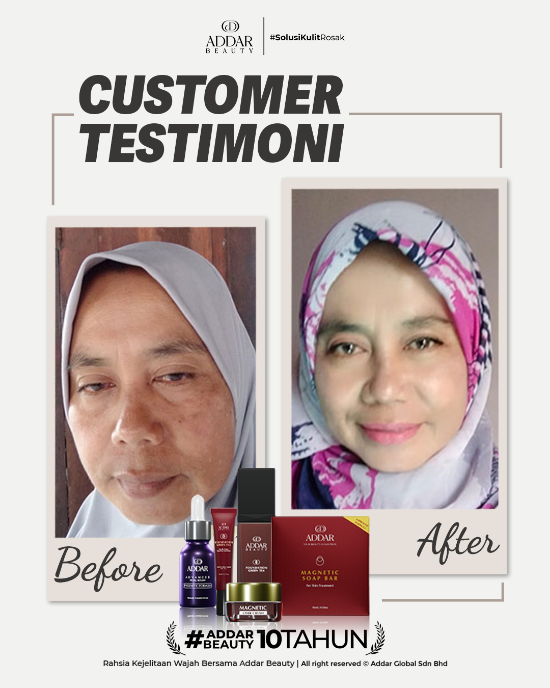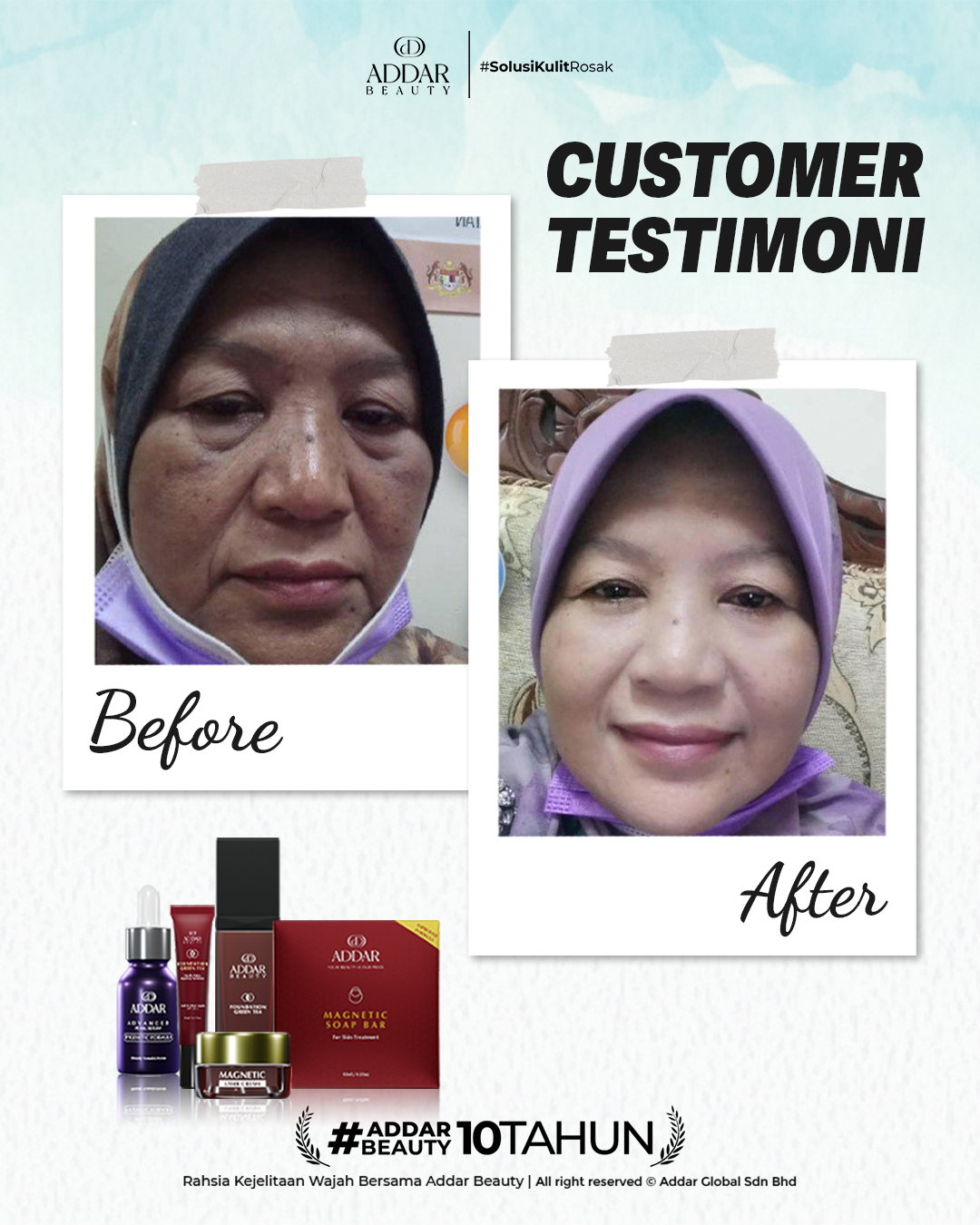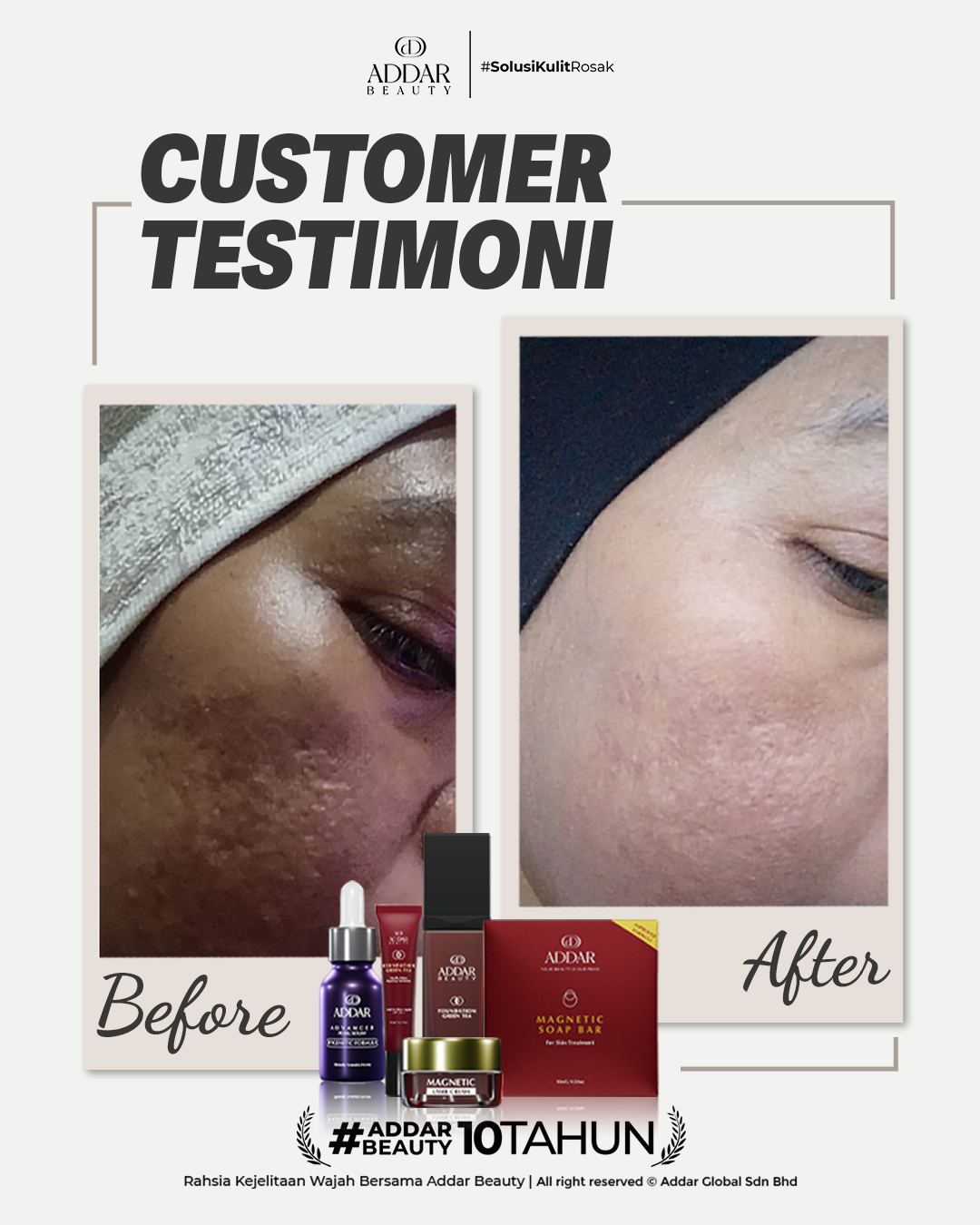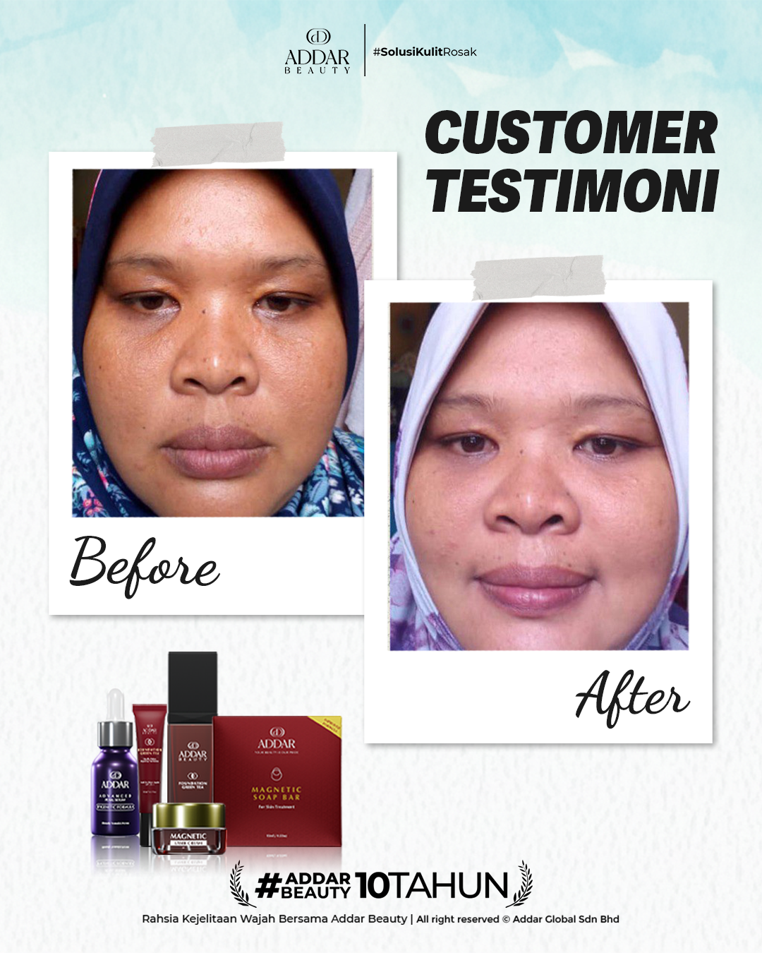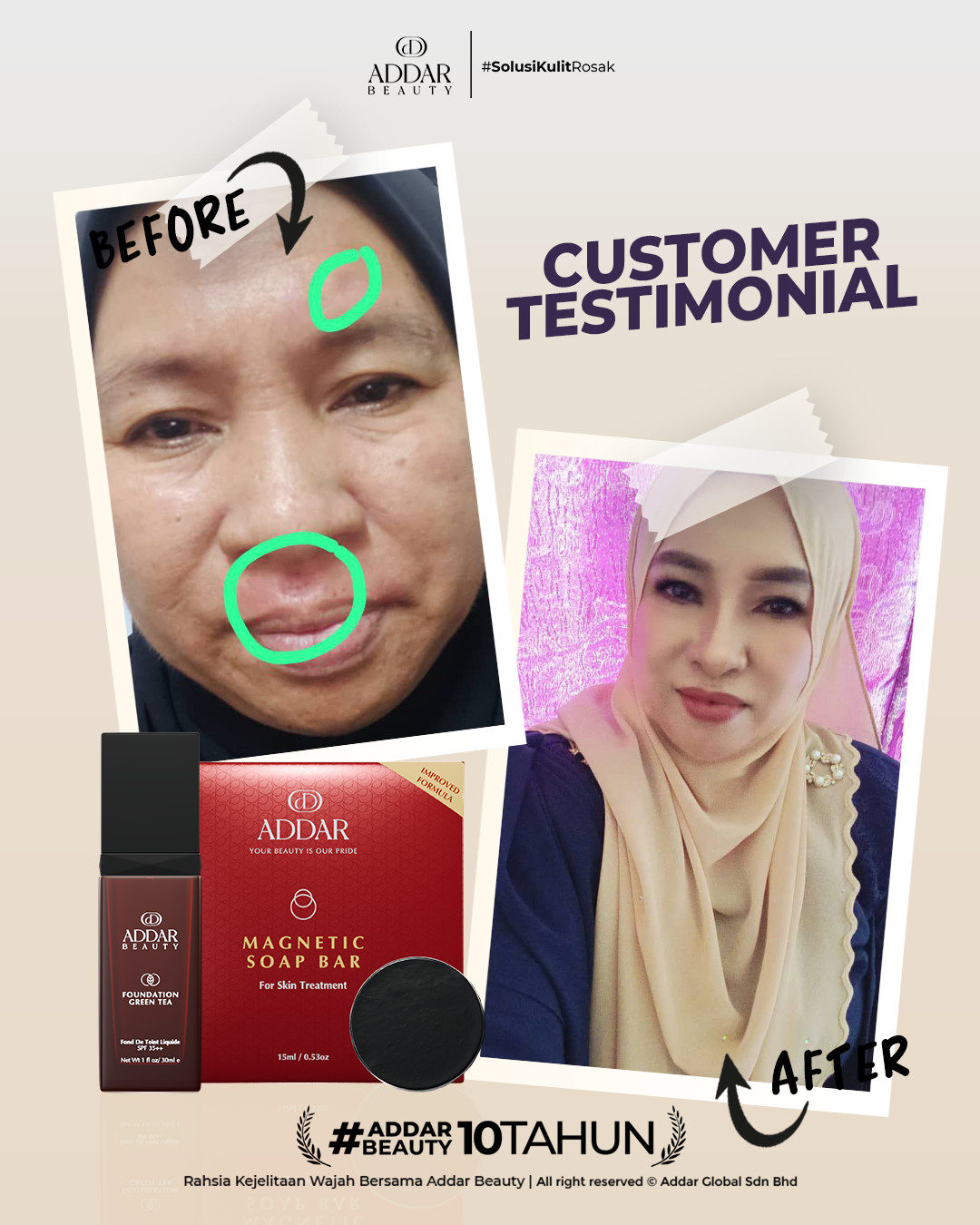 Secara logiknya, tidak memadai jika proses rawatan hanya menggunakan satu ketul sahaja untuk mendapatkan hasil yang sepatutnya. Sabun Magnetik telah terjual hampir 4.3 juta ketul di pasaran sepanjang 11 tahun Addar membantu ramai wanita yang mengalami masalah kulit rosak akibat penggunaan produk terdahulu. Di Addar, kami menyediakan proses rawatan yang betul, bukan konsep pakai hari ini dan esok terus cantik. Proses pemulihan memerlukan masa dan konsisten untuk mendapatkan hasil yang terbaik.