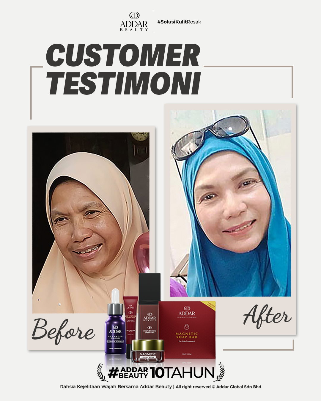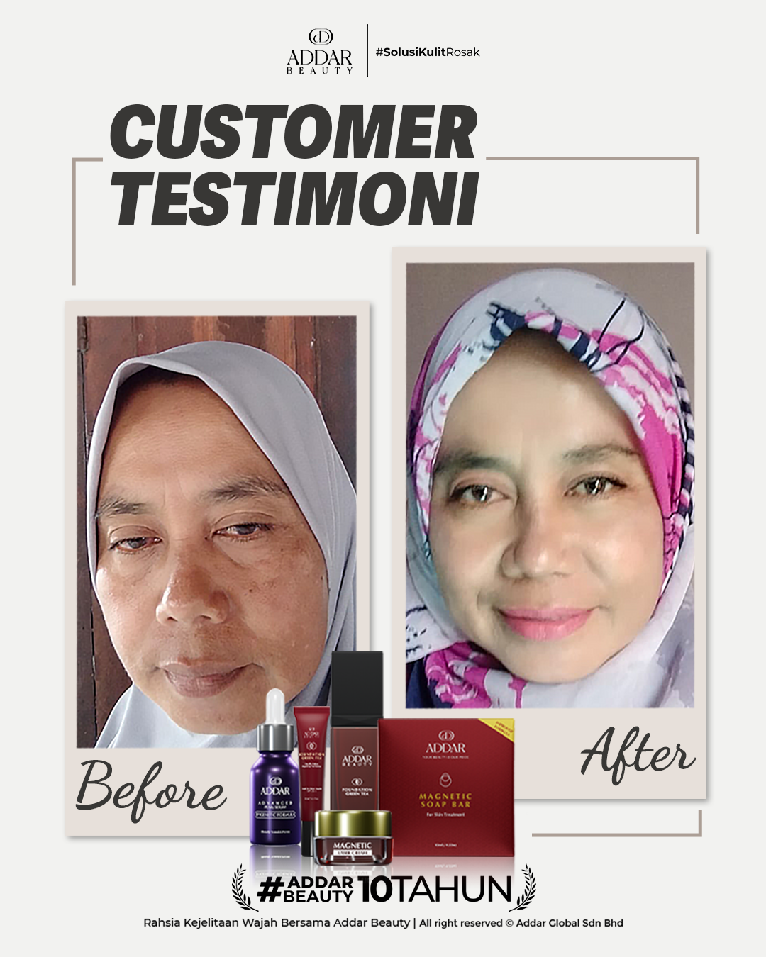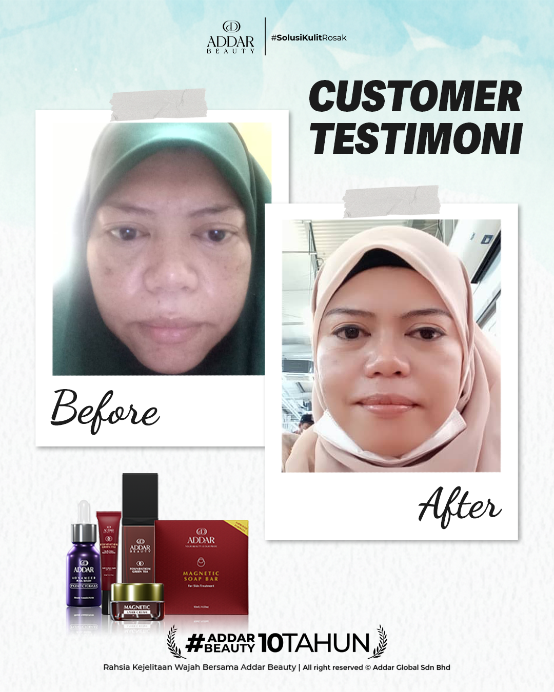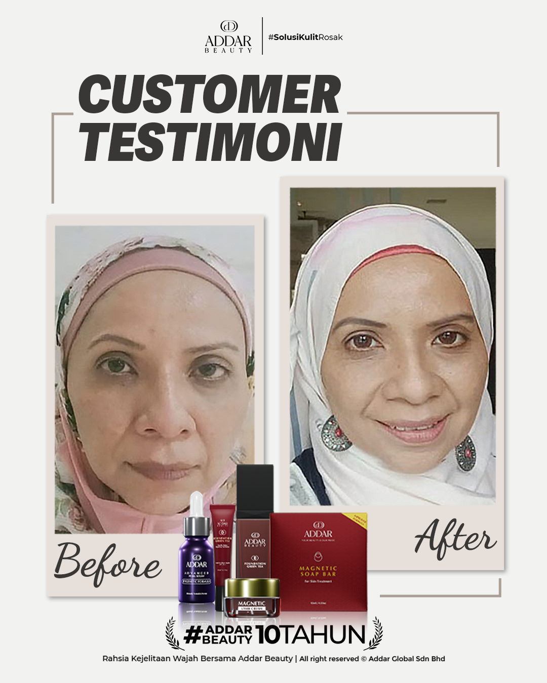 Secara logiknya, tidak memadai jika proses rawatan hanya menggunakan satu ketul sahaja untuk mendapatkan hasil yang sepatutnya. Sabun Magnetik telah terjual hampir 4.3 juta ketul di pasaran sepanjang 11 tahun Addar membantu ramai wanita yang mengalami masalah kulit rosak akibat penggunaan produk terdahulu. Di Addar, kami menyediakan proses rawatan yang betul, bukan konsep pakai hari ini dan esok terus cantik. Proses pemulihan memerlukan masa dan konsisten untuk mendapatkan hasil yang terbaik.