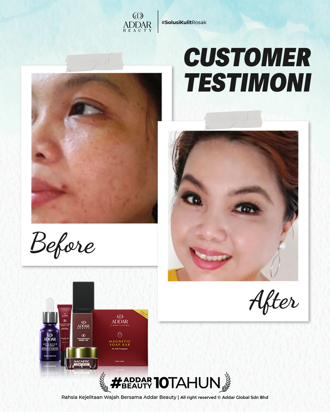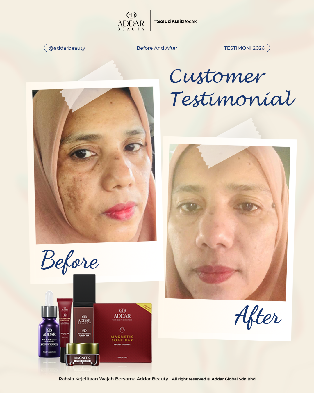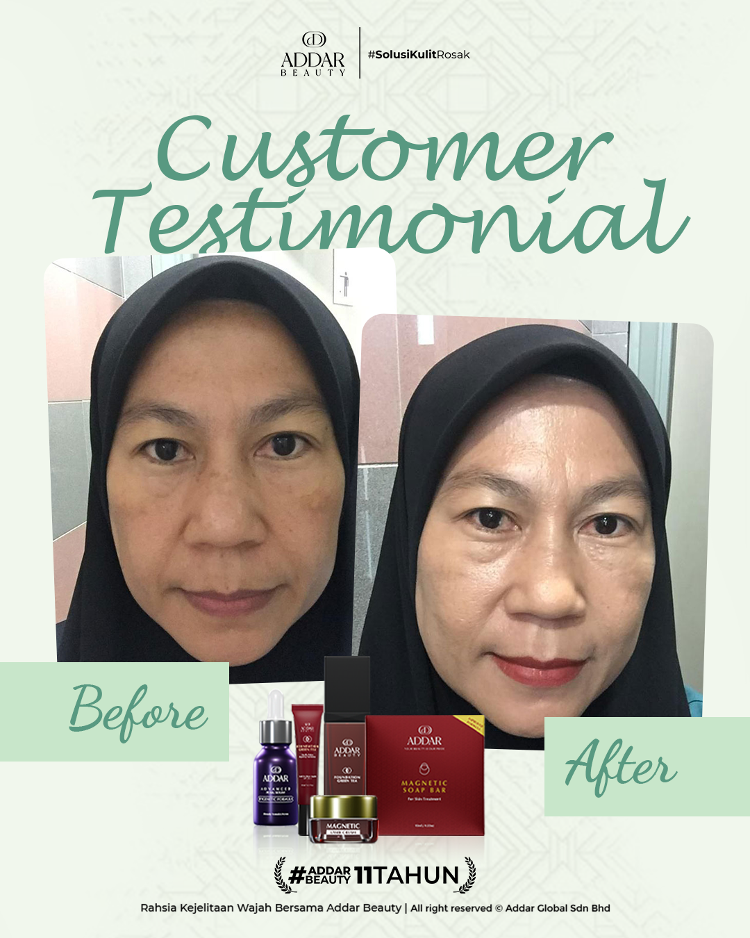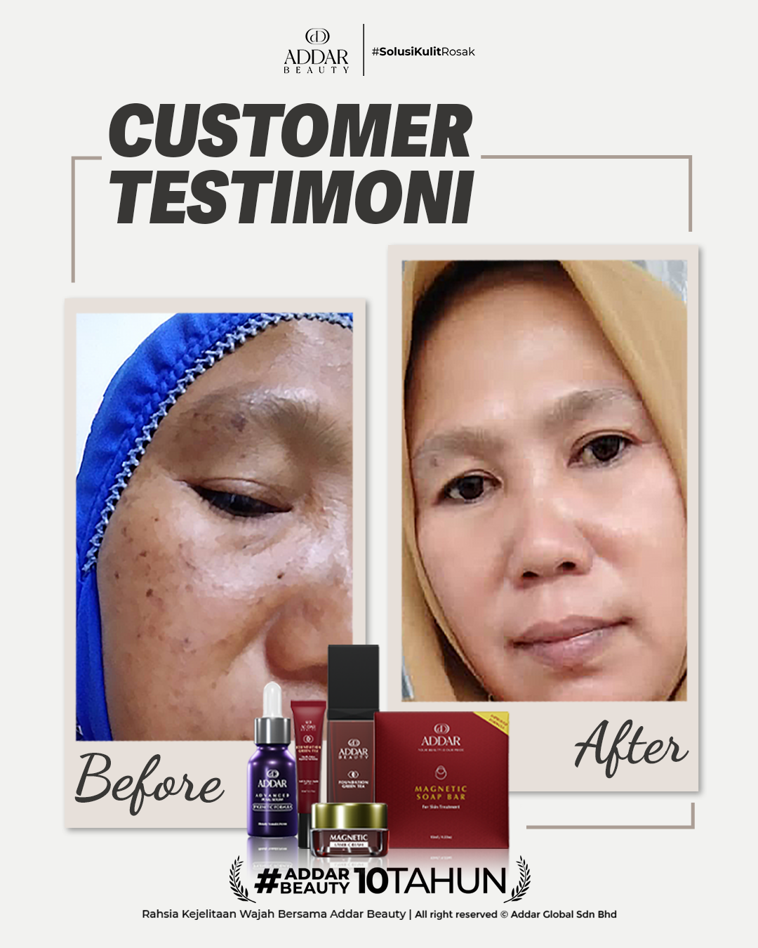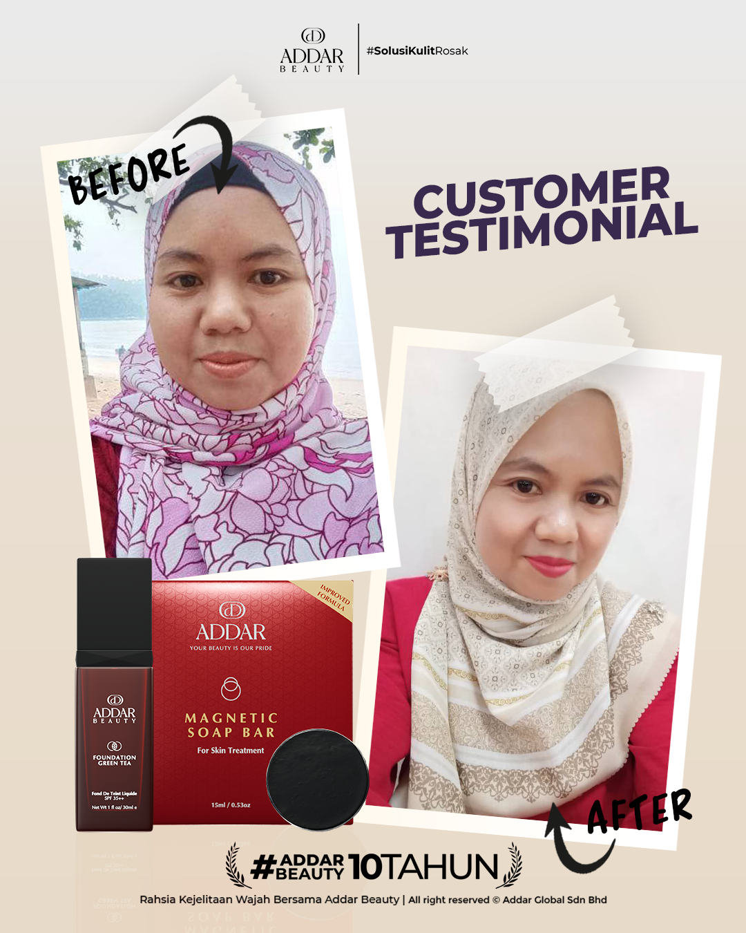 Secara logiknya, tidak memadai jika proses rawatan hanya menggunakan satu ketul sahaja untuk mendapatkan hasil yang sepatutnya. Sabun Magnetik telah terjual hampir 4.3 juta ketul di pasaran sepanjang 11 tahun Addar membantu ramai wanita yang mengalami masalah kulit rosak akibat penggunaan produk terdahulu. Di Addar, kami menyediakan proses rawatan yang betul, bukan konsep pakai hari ini dan esok terus cantik. Proses pemulihan memerlukan masa dan konsisten untuk mendapatkan hasil yang terbaik.