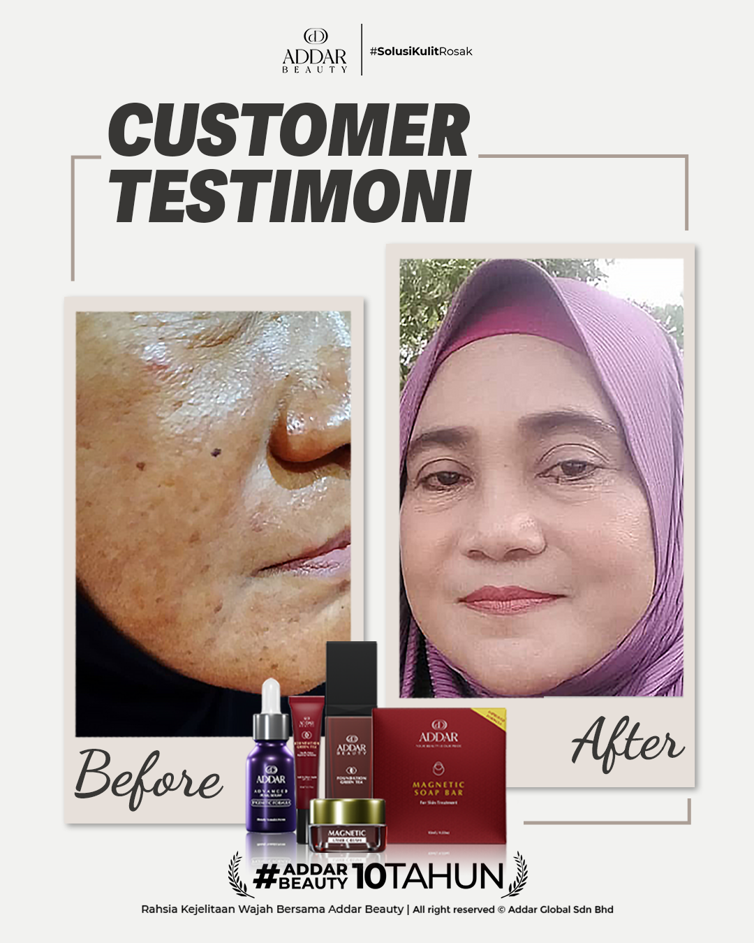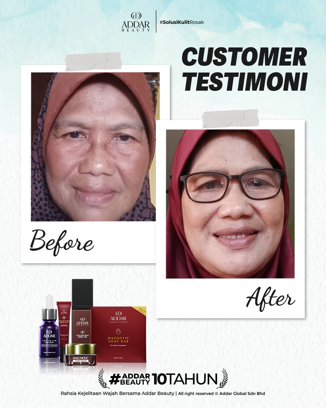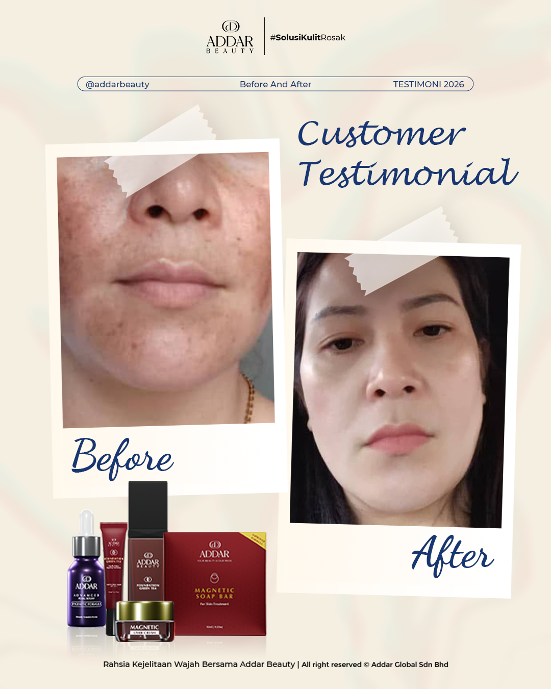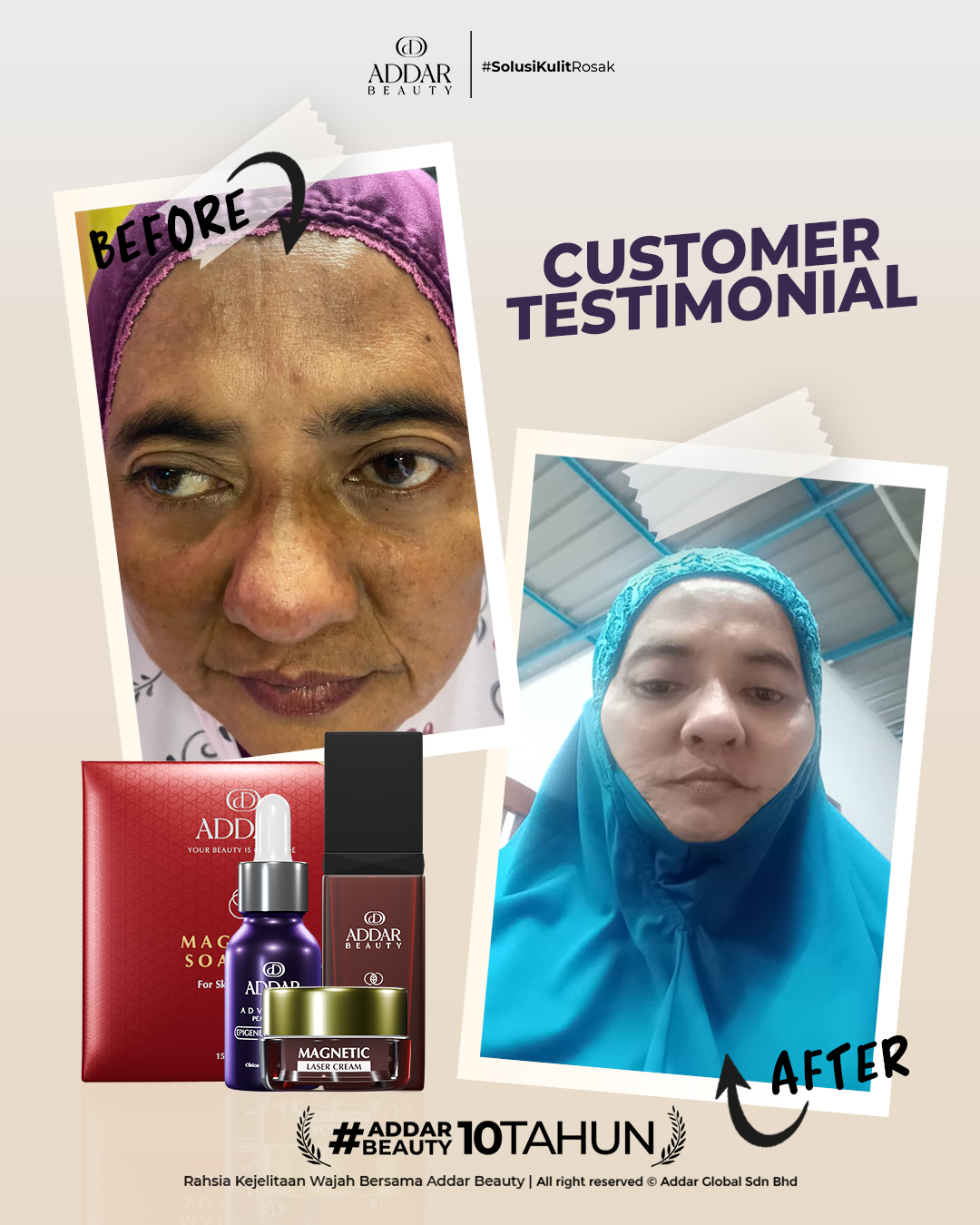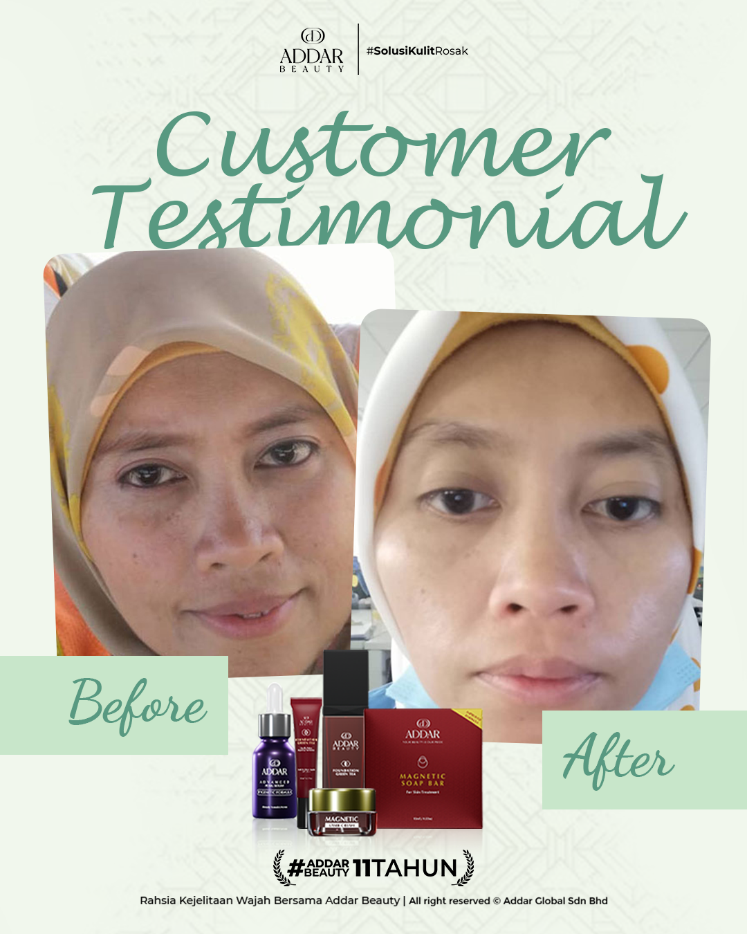 Secara logiknya, tidak memadai jika proses rawatan hanya menggunakan satu ketul sahaja untuk mendapatkan hasil yang sepatutnya. Sabun Magnetik telah terjual hampir 4.3 juta ketul di pasaran sepanjang 11 tahun Addar membantu ramai wanita yang mengalami masalah kulit rosak akibat penggunaan produk terdahulu. Di Addar, kami menyediakan proses rawatan yang betul, bukan konsep pakai hari ini dan esok terus cantik. Proses pemulihan memerlukan masa dan konsisten untuk mendapatkan hasil yang terbaik.