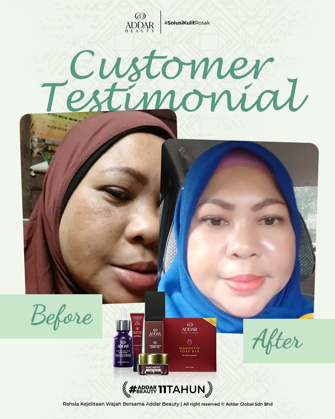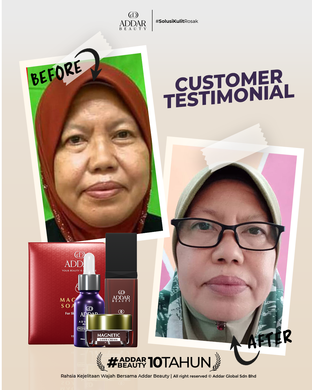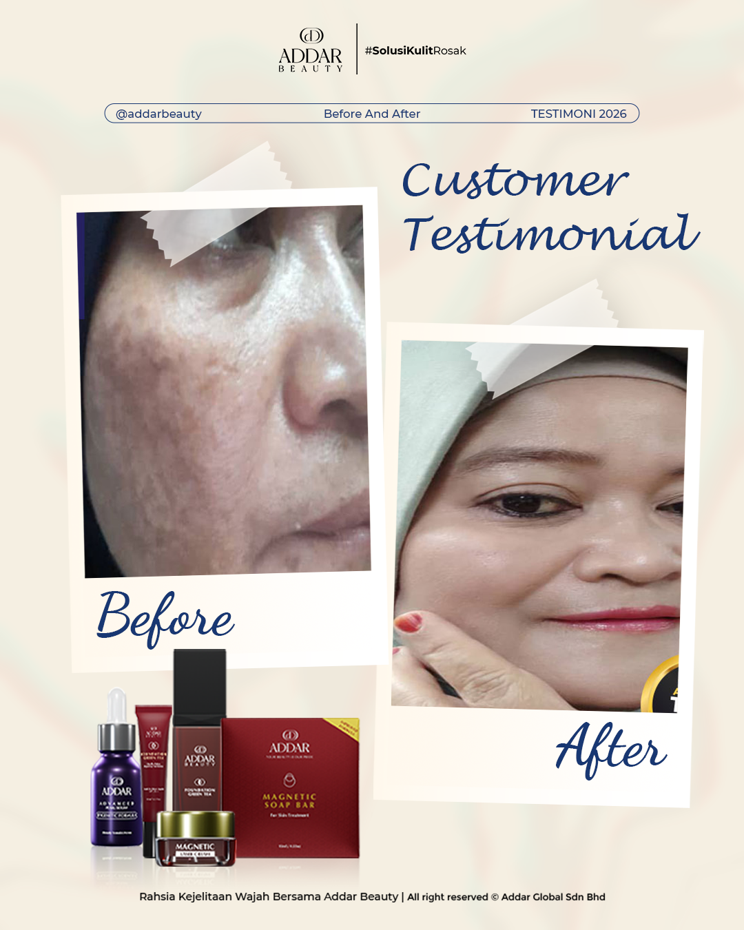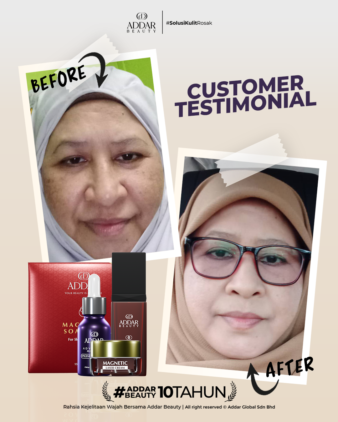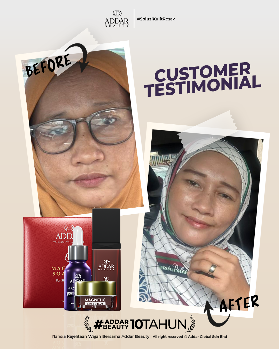 Secara logiknya, tidak memadai jika proses rawatan hanya menggunakan satu ketul sahaja untuk mendapatkan hasil yang sepatutnya. Sabun Magnetik telah terjual hampir 4.3 juta ketul di pasaran sepanjang 11 tahun Addar membantu ramai wanita yang mengalami masalah kulit rosak akibat penggunaan produk terdahulu. Di Addar, kami menyediakan proses rawatan yang betul, bukan konsep pakai hari ini dan esok terus cantik. Proses pemulihan memerlukan masa dan konsisten untuk mendapatkan hasil yang terbaik.