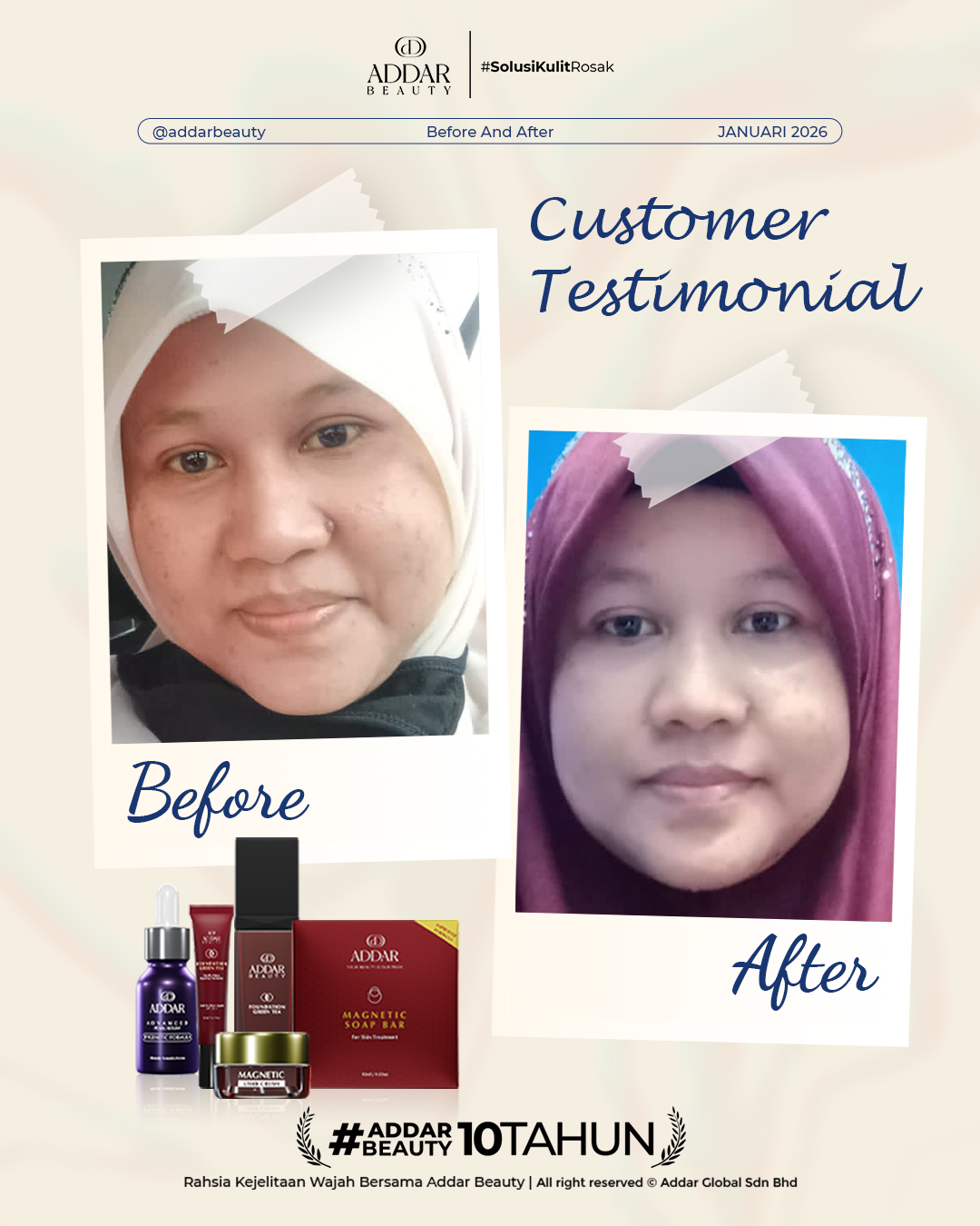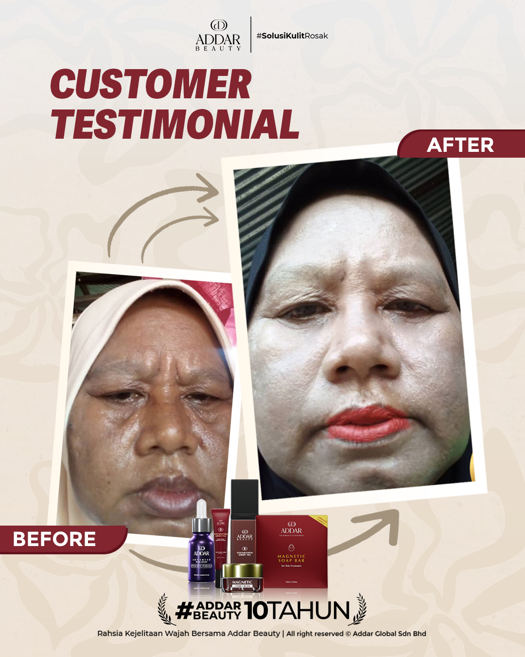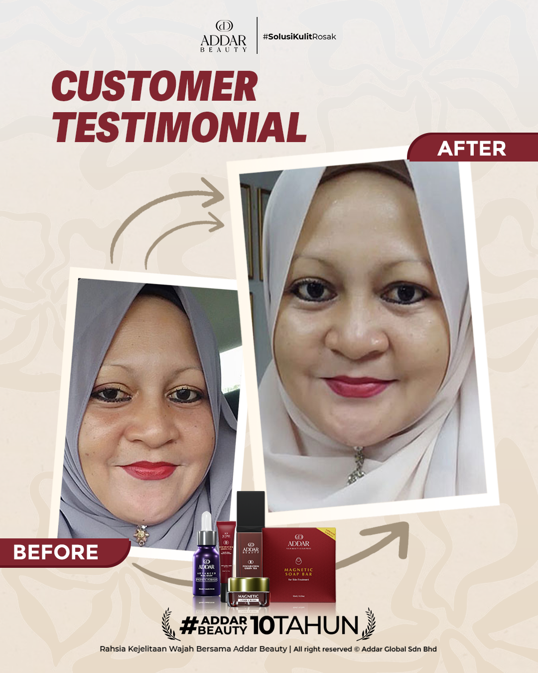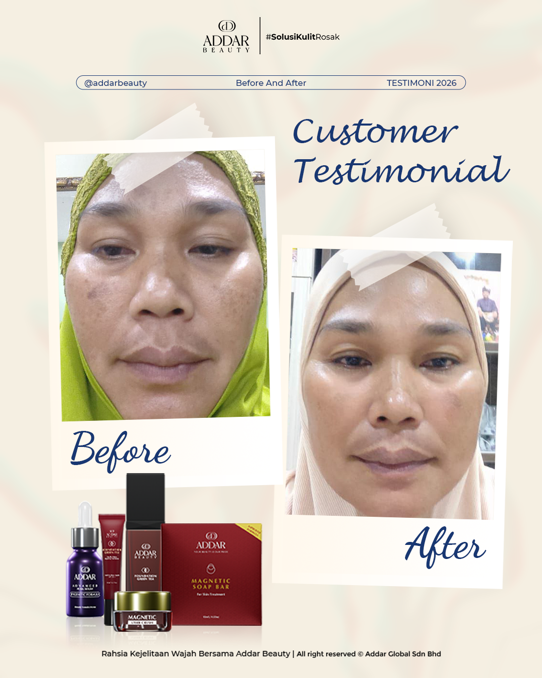 Secara logiknya, tidak memadai jika proses rawatan hanya menggunakan satu ketul sahaja untuk mendapatkan hasil yang sepatutnya. Sabun Magnetik telah terjual hampir 4.3 juta ketul di pasaran sepanjang 11 tahun Addar membantu ramai wanita yang mengalami masalah kulit rosak akibat penggunaan produk terdahulu. Di Addar, kami menyediakan proses rawatan yang betul, bukan konsep pakai hari ini dan esok terus cantik. Proses pemulihan memerlukan masa dan konsisten untuk mendapatkan hasil yang terbaik.