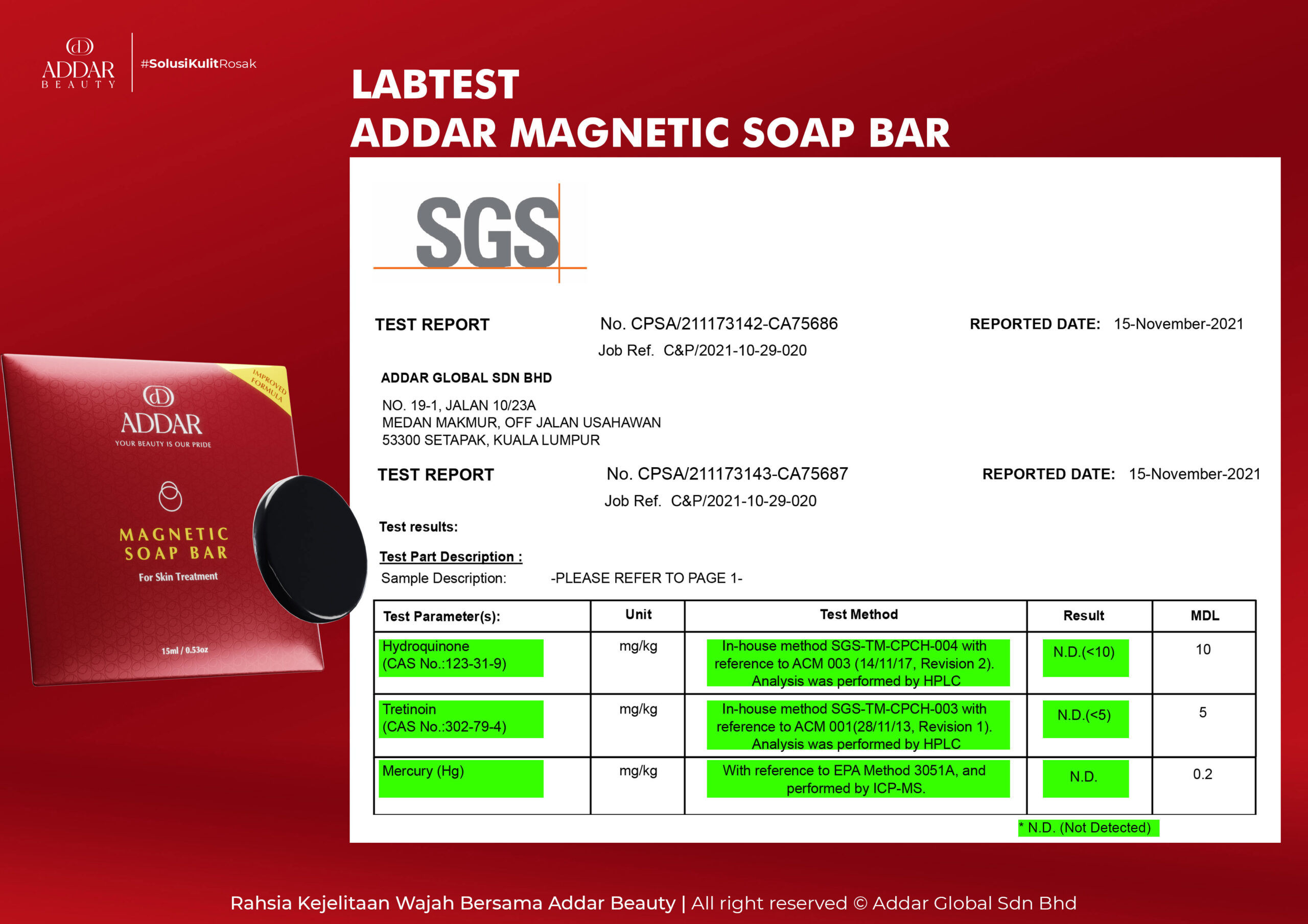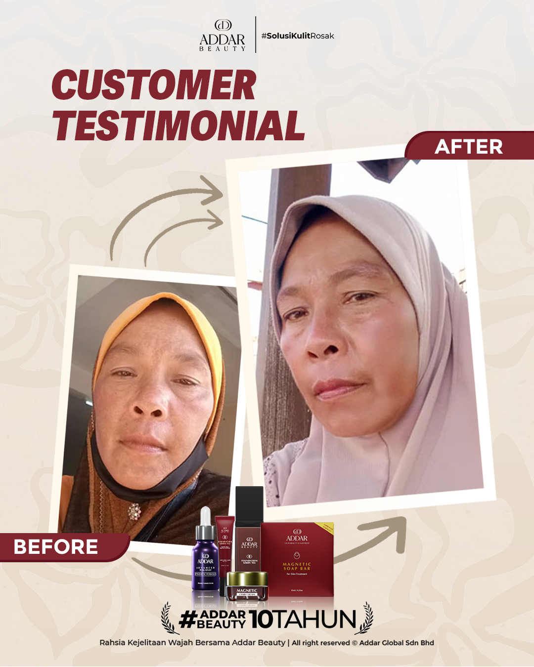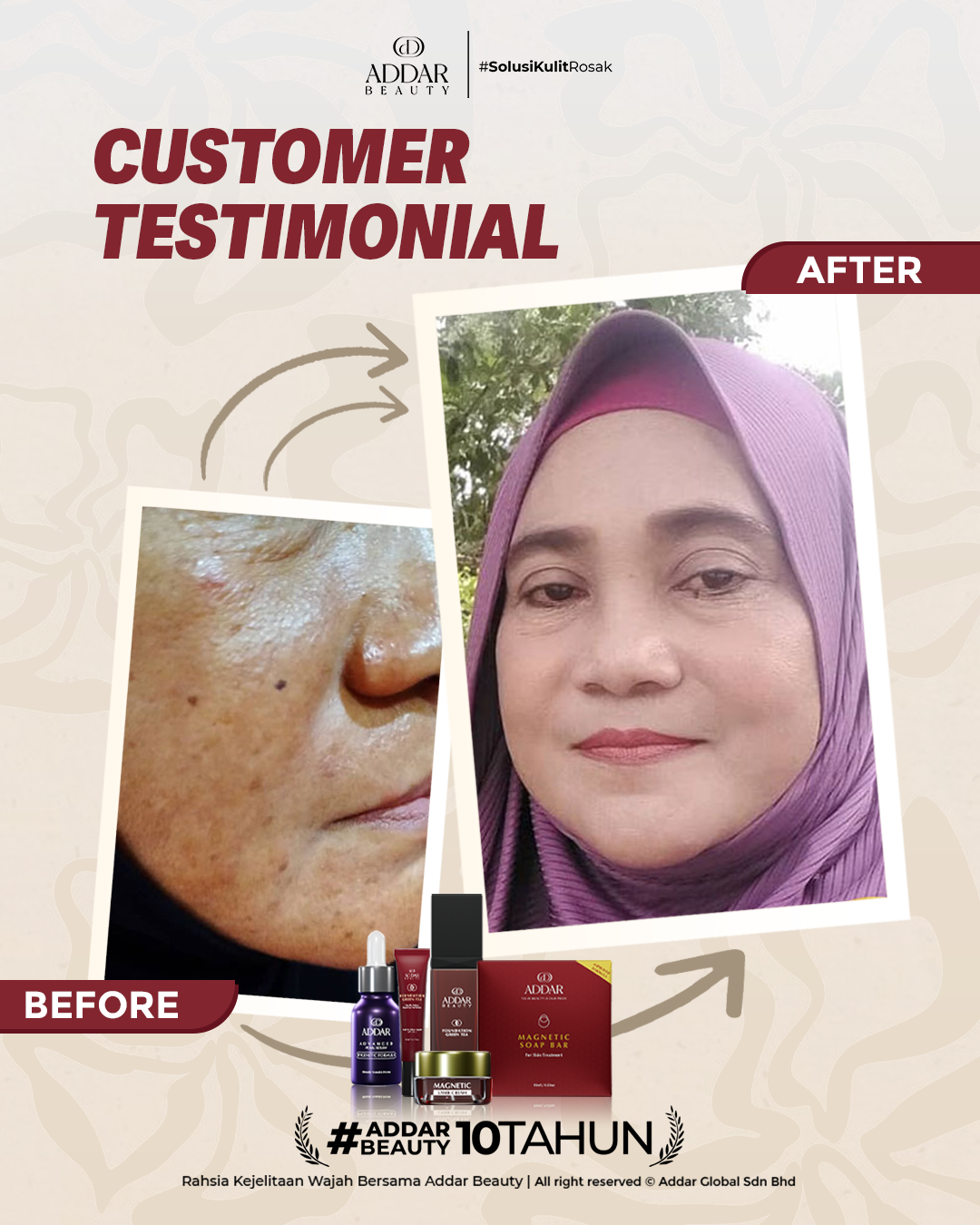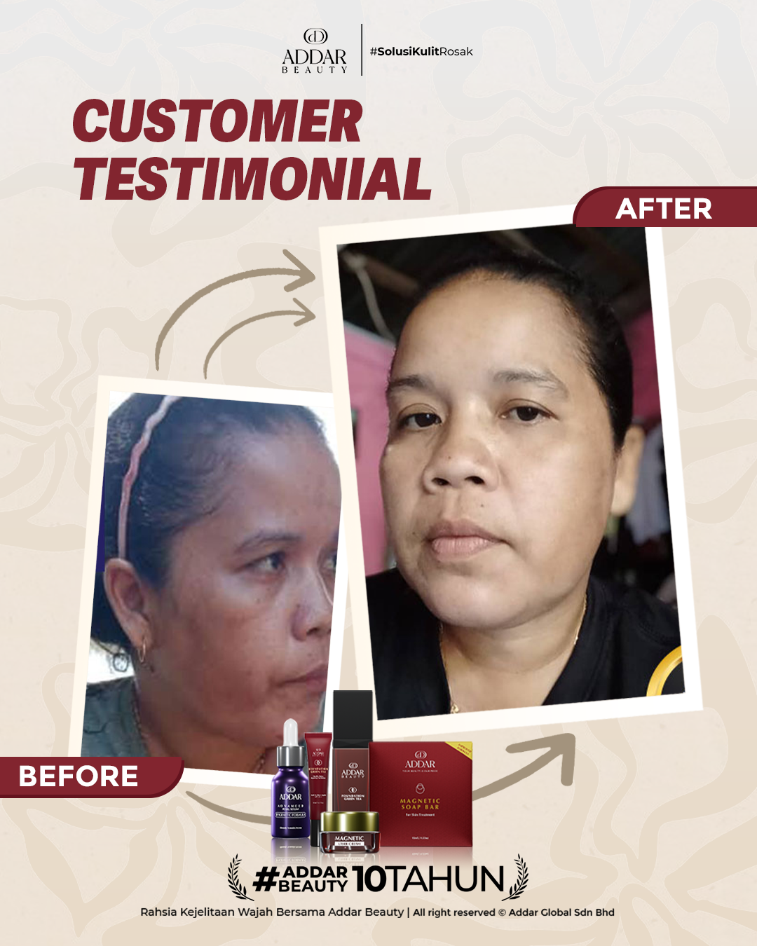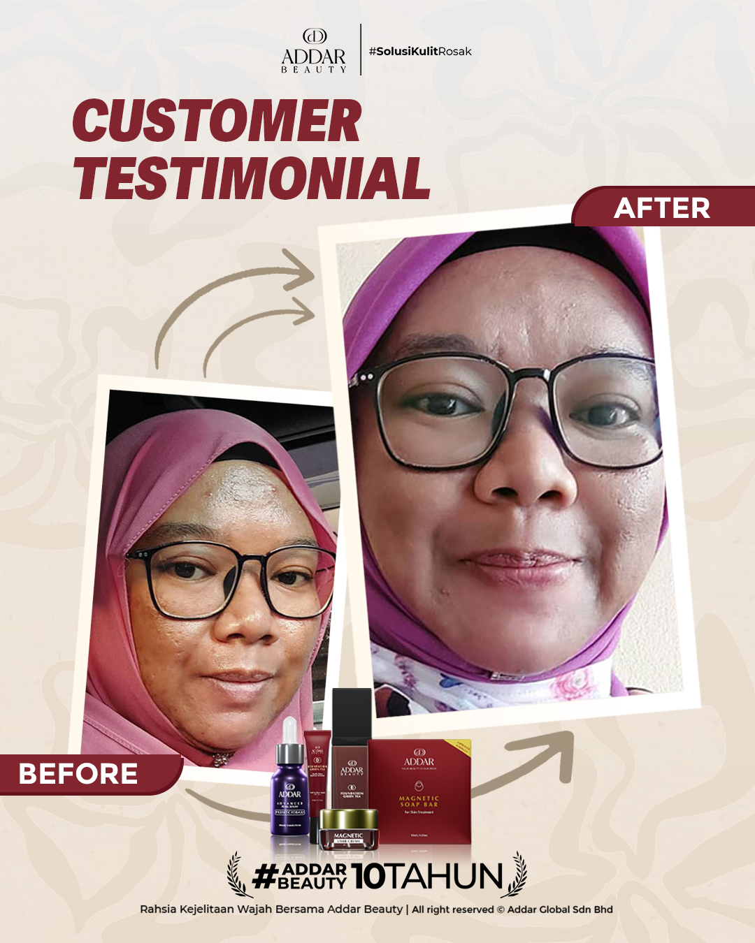 Secara logiknya, tidak memadai jika proses rawatan hanya menggunakan satu ketul sahaja untuk mendapatkan hasil yang sepatutnya. Sabun Magnetik telah terjual hampir 4.3 juta ketul di pasaran sepanjang 11 tahun Addar membantu ramai wanita yang mengalami masalah kulit rosak akibat penggunaan produk terdahulu. Di Addar, kami menyediakan proses rawatan yang betul, bukan konsep pakai hari ini dan esok terus cantik. Proses pemulihan memerlukan masa dan konsisten untuk mendapatkan hasil yang terbaik.